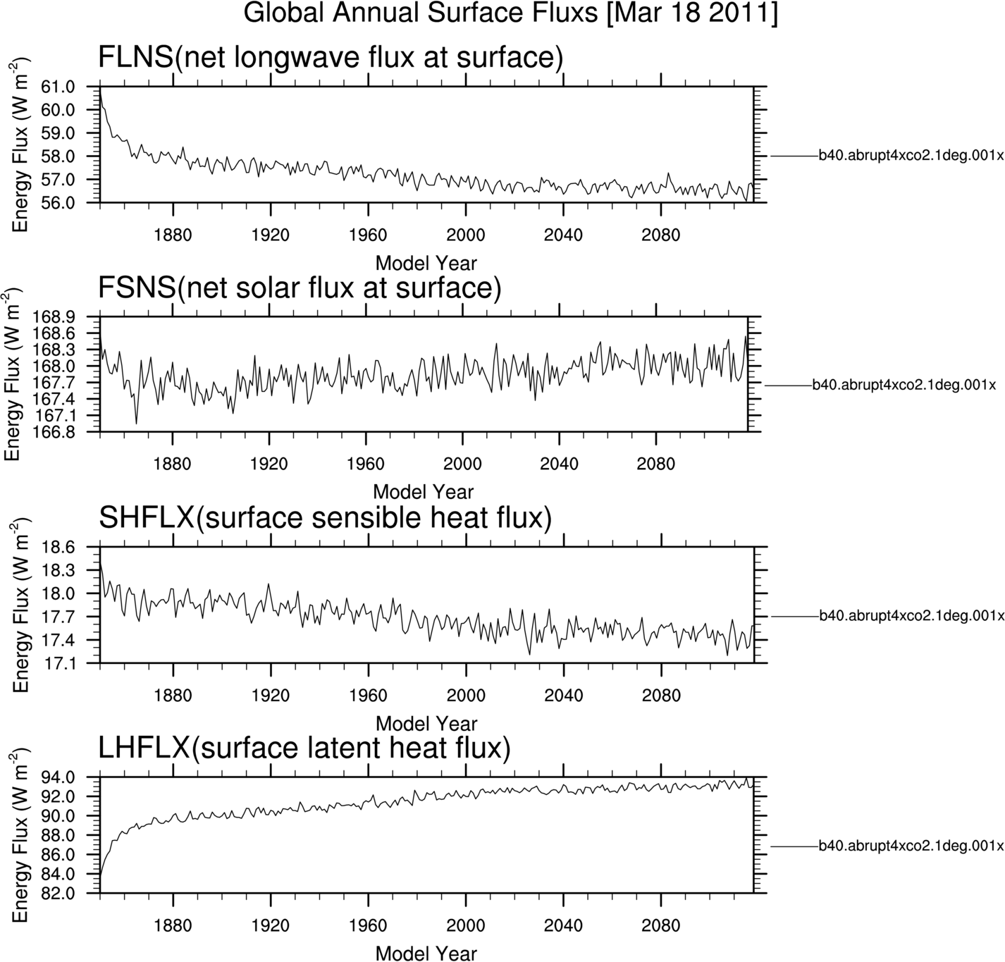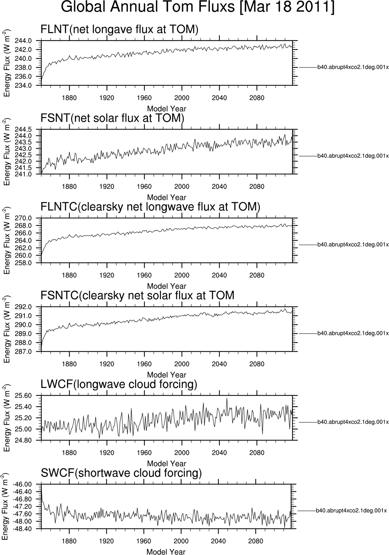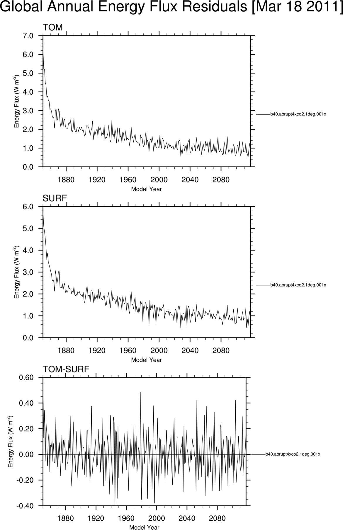 b40.abrupt4xco2.1deg.001 Annual Mean Timeseries TOM-SURF residual flux TOM fluxes Surface fluxes Hydrologic cycle fluxes NH and SH ice area NH snow depth over land Surface temperatures Nino Anomalies Carbon Optical Depths Dust Optical Depths Solar Insolation Ozone CO2vmr