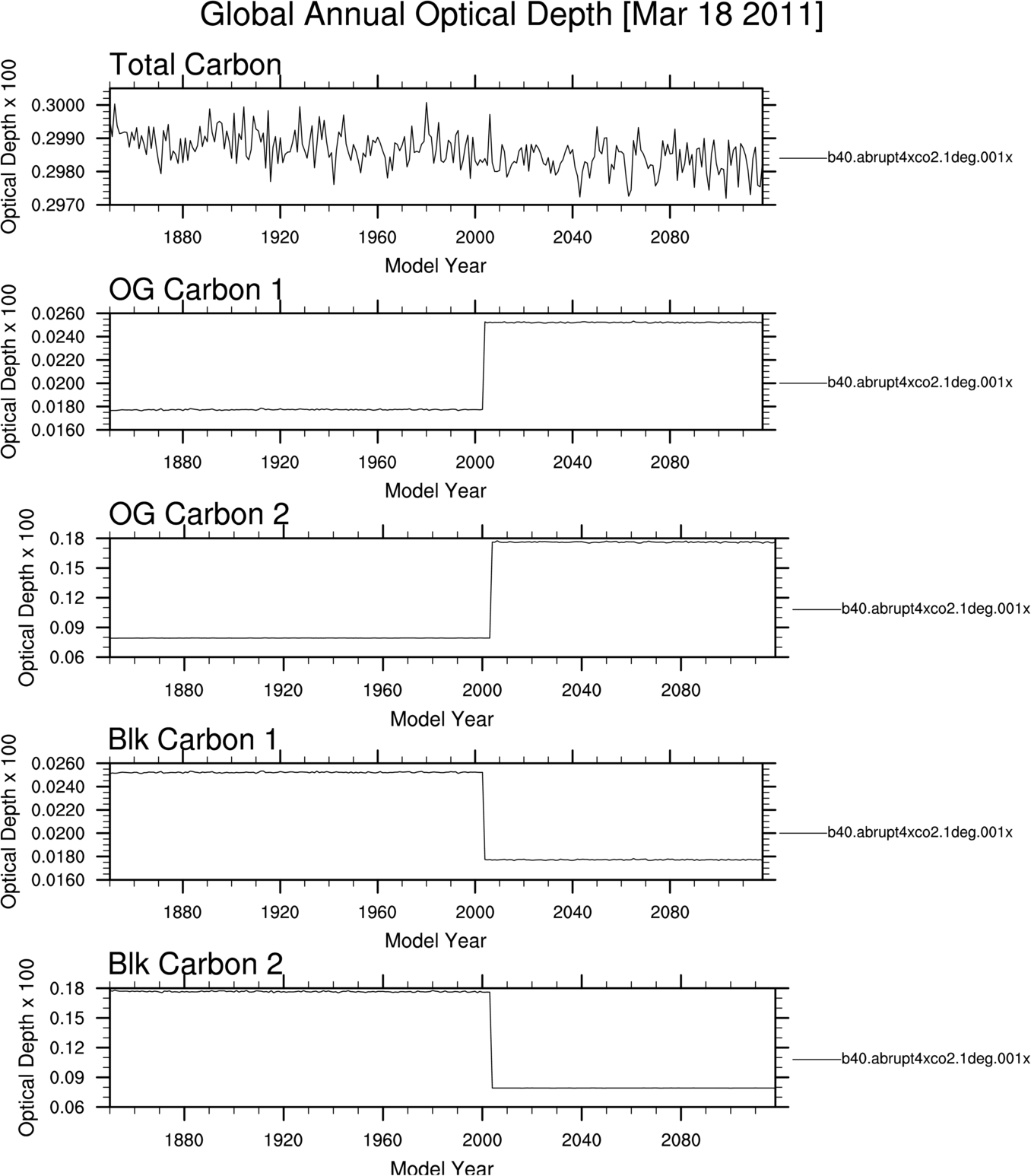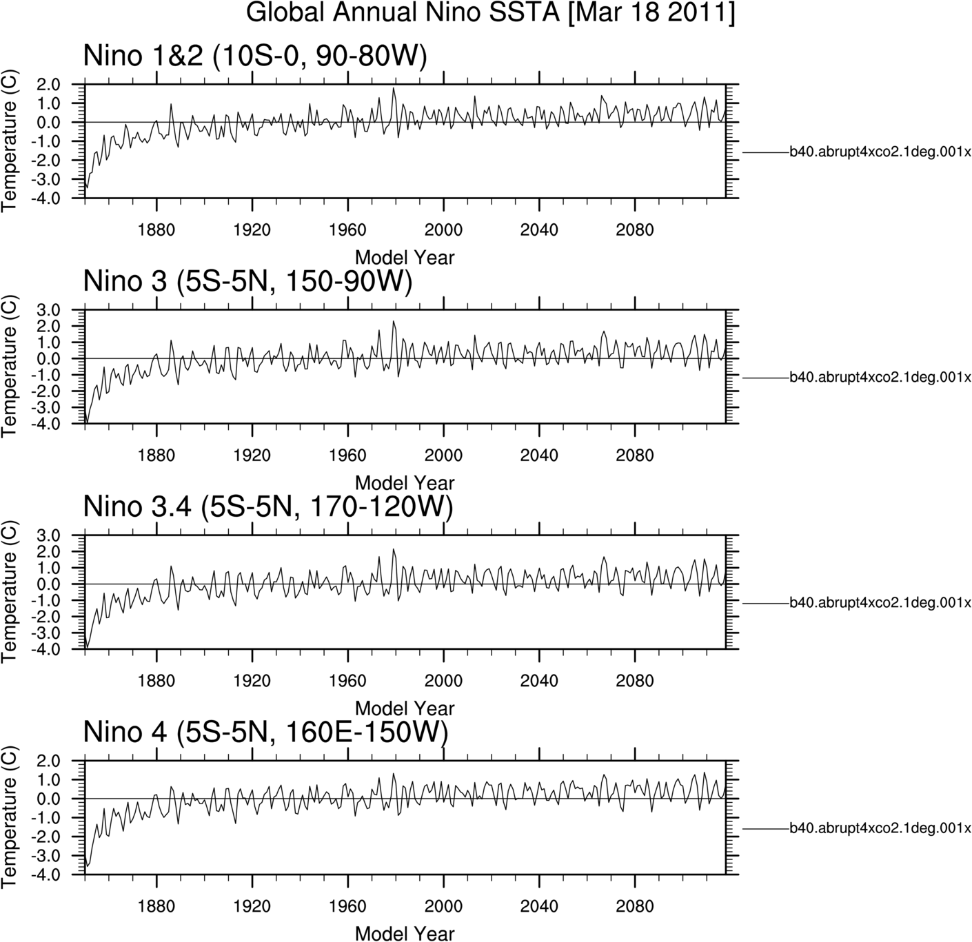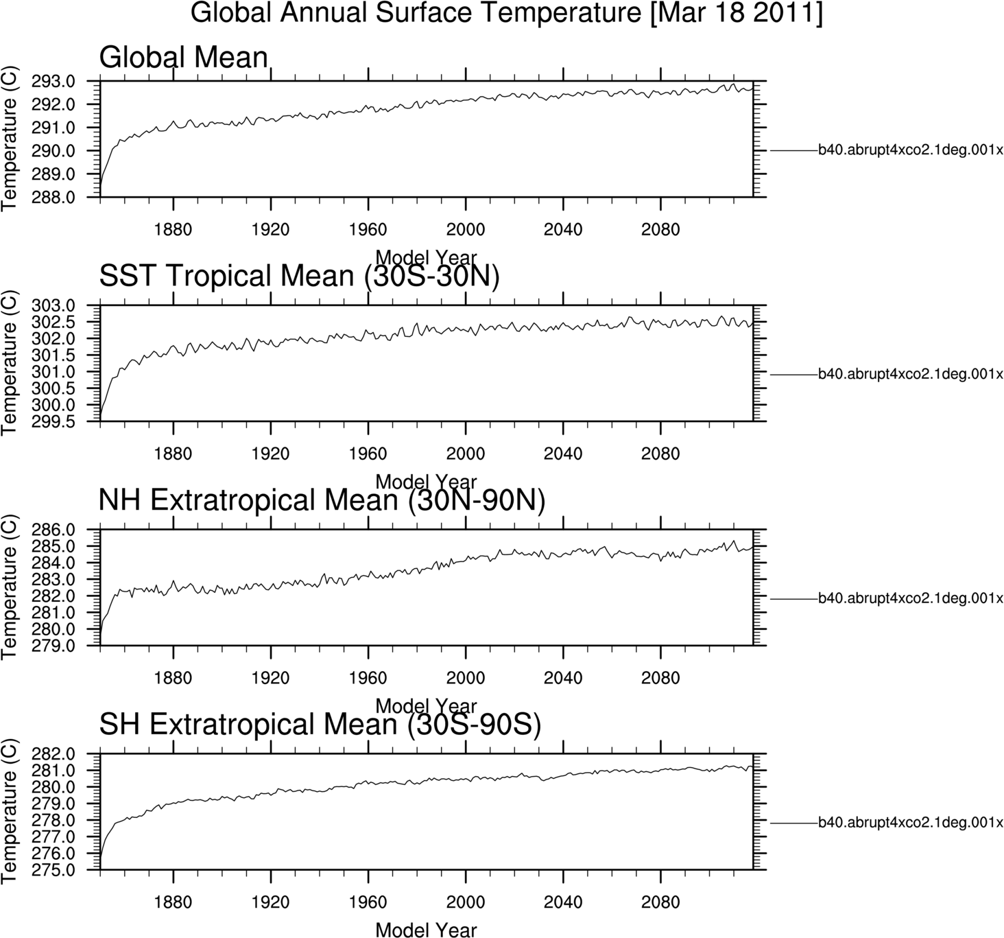 b40.abrupt4xco2.1deg.001 Annual Mean Timeseries TOM-SURF residual flux TOM fluxes Surface fluxes Hydrologic cycle fluxes NH and SH ice area NH snow depth over land Surface temperatures Nino Anomalies Carbon Optical Depths Dust Optical Depths Solar Insolation Ozone CO2vmr